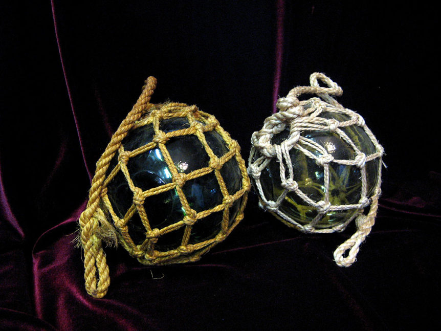 Alkuperä: Tuntematon Valmistusajankohta: 1900-luvun alkupuoli Koko: Halkaisija n. 15 cm Kunto: Kohtalainen, ajanmukaista kulumaa / patinaa Muuta: Harvinaisempaa meriantiikkia edullisesti, hieno pari vaikkapa sisustuskäyttöön. Puhallettu lasi, punottu vanha köysisukka ympärillä. Lasissa kaunis vihertävä sävy.
