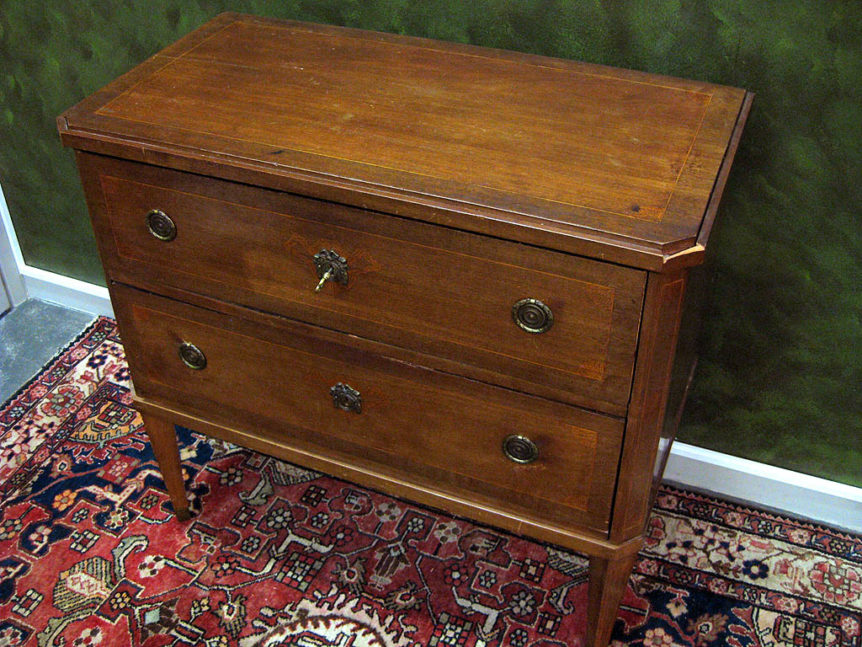 Alkuperä: Ruotsi Valmistusajankohta: 1800-l. Koko: Leveys 85 cm, syvyys 45 cm, korkeus 81 cm Kunto: Kohtalainen, oikealta etukulman listasta lähtenyt pieni pala irti (helpohkosti korjattavissa), kansilevyssä kulumaa/naarmuja, pinnoissa patinaa Muuta: Siro myöhäiskustavilainen lipasto hienolla alkuperäisvärillä. Mahonkiset intarsia -koristelut laatikoissa ja kannessa, hienot pronssiset vetimet.