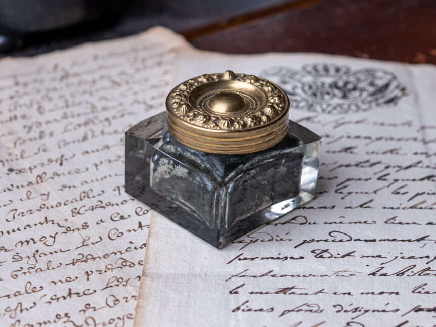 Alkuperä: Eurooppa Valmistusajankohta: 1900-luvun alkupuoli Mitat: Korkeus 4,5 x 4,5 x 4 cm Materiaali: Lasi Kunto: Hyvä, ajanmukaista kulumaa / patinaa Muuta: Tyylikäs mustepullo työhuoneen paraatipaikalle, eli työpöydälle. Tässä olisi esimerkiksi upea lahjaidea vanhoja tavaroita arvostavalle.