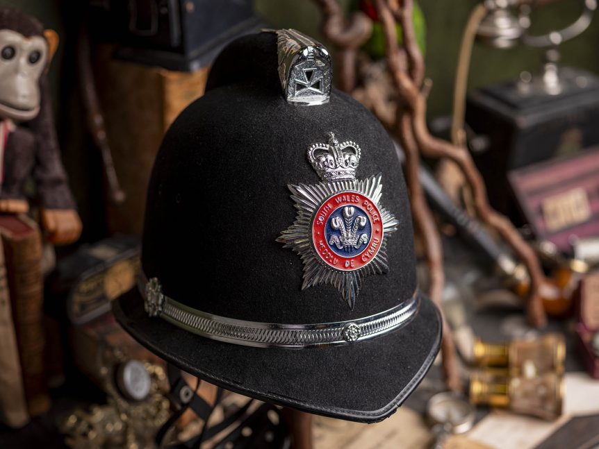 Alkuperä: Etelä-Wales Valmistusajankohta: 1900/2000 Mitat: miesten large Kunto: Hyvä, pinnoissa ajanmukaista kulumaa / patinaa Muuta: Englantilaisen poliisin käytössä ollut virkakypärä on hieno lisä kokoelmaan, rekvisiitaksi tai poliisileikkeihin.