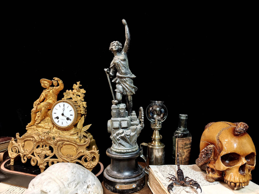 Alkuperämaa: Ranska Taiteilija: Tuntematon Valmistusajankohta: 1890-1910 Mitat: Korkeus n. 50 cm Paino: n. 1,5 kg Materiaali: Spelter, eli 1800-luvulla suosittu sinkkimetalliseos Kunto: Hyvä, ajanmukaista kulumaa / patinaa. Muuta: Näyttävä ja kookas ranskalainen allegoriapatsas, joka esittää teollisuuden personifikaatiota “L’Industrie”. Hahmo kohoaa teollisten elementtien, kuten hammasrattaiden, rakenteiden ja koneistusta muistuttavien yksityiskohtien yläpuolelle, mikä korostaa teoksen symboliikkaa ja aikakauden edistysuskoa. Kokonaisuus on vaikuttava …